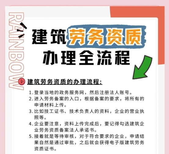 • 隨著建筑施工勞務資質正式由審批制改為備案制,大大縮短業務流程,企業申請施工勞務資質可以做到當天就能拿到資質證書......